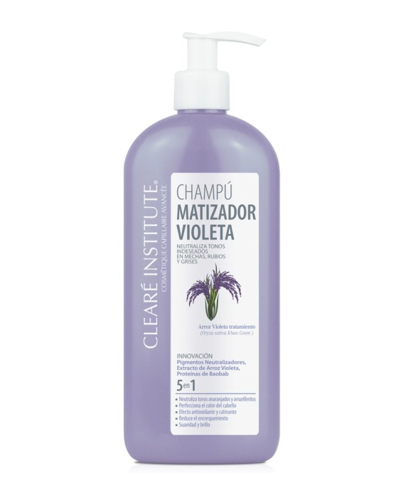 El Champú Matizador Violeta de Clearé Institute neutraliza tonos indeseados en mechas, rubios y grises. 96,6% del total es de origen natural.El cabello recupera su color natural, brillo y suavidad.INNOVACIÓN: Pigmentos Neutralizadores, Extracto de Arroz Violeta, Proteínas de Baobab. 5 en 1:Neutraliza tonos anaranjados y amarillentosPerfecciona el color del cabelloEfecto antioxidante y calmanteReduce el encrespamientoSuavidad y brilloEl Champú Matizador Violeta de Clearé Institute, es un tratamiento que atenúa los tonos amarillentos e ilumina el cabello, eliminando tonos indeseados. Perfecciona el color y muestra la belleza de tus cabellos, con mechas, rubios o grises. Formulado con Pigmentos y extractos botánicos que iluminan el cabello y lo revitalizan. Indicado para mujeres y hombres con problemas de tonos indeseados.PIGMENTOS NEUTRALIZADORES Pigmentos concentrados que se fijan y neutralizan tonos anaranjados y amarillentos, matizando el color del cabello y recuperando su luminosidad y belleza.EXTRACTO DE ARROZ VIOLETA Efecto antioxidante y calmante, confort para el cuero cabelludo. Sus proteínas protegen el cabello de las agresiones externas, reparándolo, acondicionándolo y mejorando su elasticidad.PROTEÍNAS DE BAOBAB Responsables de la recuperación instantánea del cabello dañado por ataques químicos y envejecido por el paso del tiempo. Reduce el encrespamiento, rejuvenece, cabello más suave, más brillo. Protector de la radiación ultravioleta.AGENTES DE LIMPIEZA ''Natural Biolipids'' Proporcionan al cabello más fuerza y nutrición.Es necesario el uso de guantes. Humedecer el cabello y retirar el exceso de agua. Aplicar pequeñas cantidades e ir masajeando bien todo el cabello, raíces, medios y puntas. Añadir una pequeña cantidad de agua y emulsionar. Esperar de 2 a 5 minutos y aclarar con abundante agua.