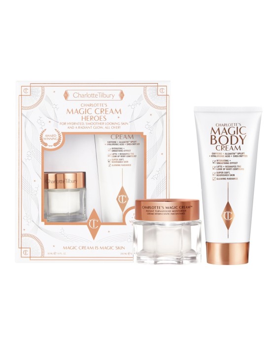 Disfruta de la mejor rutina de belleza Magic Skin con este set de edición limitada que incluye una Magic Cream de 50 ml y una Magic Body Cream de 200 ml.La MAGIC CREAM es una galardonada crema hidratante de efecto instantáneo, que impregna tu piel de humedad para conseguir un cutis hidratado y con un aspecto más terso. Adorada por EXPERTOS y ESTRELLAS, contiene la Charlotte's MAGIC 8 MATRIX que incluye ácido hialurónico, vitaminas C+E y complejo de péptidos con efecto REAFIRMANTE para una piel de aspecto HIDRATADO, RADIANTE y más SUAVE. ¡Los RESULTADOS se ven en 28 segundos y 28 días!La MAGIC BODY CREAM es tu crema corporal para revitalizar la piel al instante, desarrollada a partir de la galardonada Magic Cream.Esta crema hidratante con efecto reafirmante contiene el Magic 8 Matrix de Charlotte y otras fórmulas específicas para el cuerpo que mejoran el aspecto y el tacto de tu piel cada vez que la usas.